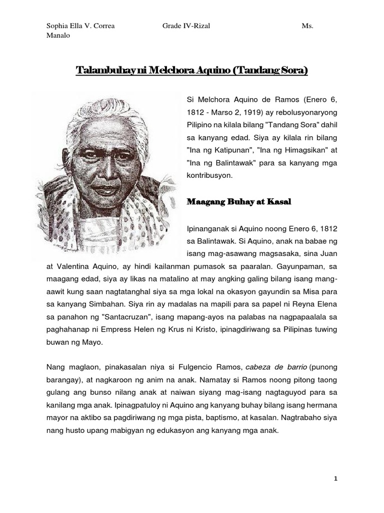 Ginagalang siya sa kanilang pamayanan palibhasay maganda itong si Batang Sora. Nakilala sa larangan. Melchora Aquino de Ramos January 6 1812 February 19 1919 was a Filipina revolutionary who became known as Tandang Sora Elder Sora because of her age during the Philippine Revolution.